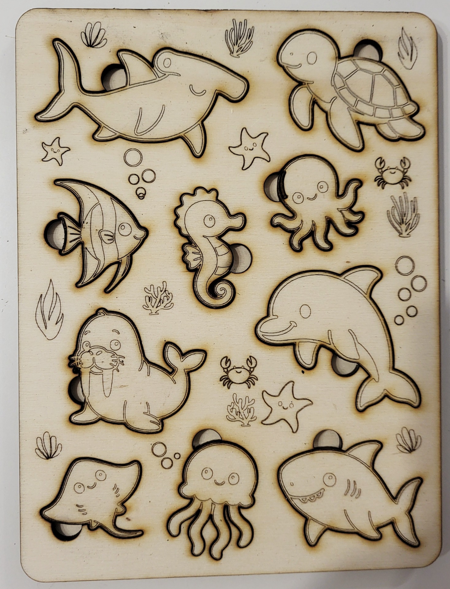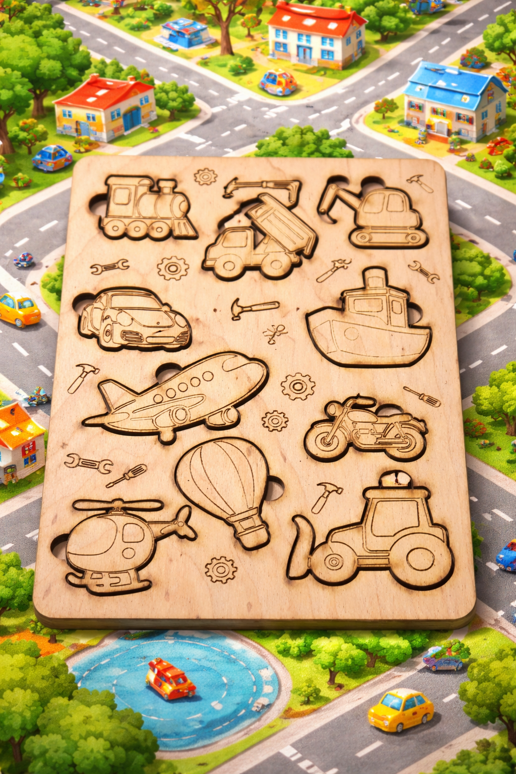 - egy különálló, formára vágott felső kirakós rétegből, amelyeket precíz lézergravírozással készítünk 4 mm vastag rétegelt fa lemezből.
