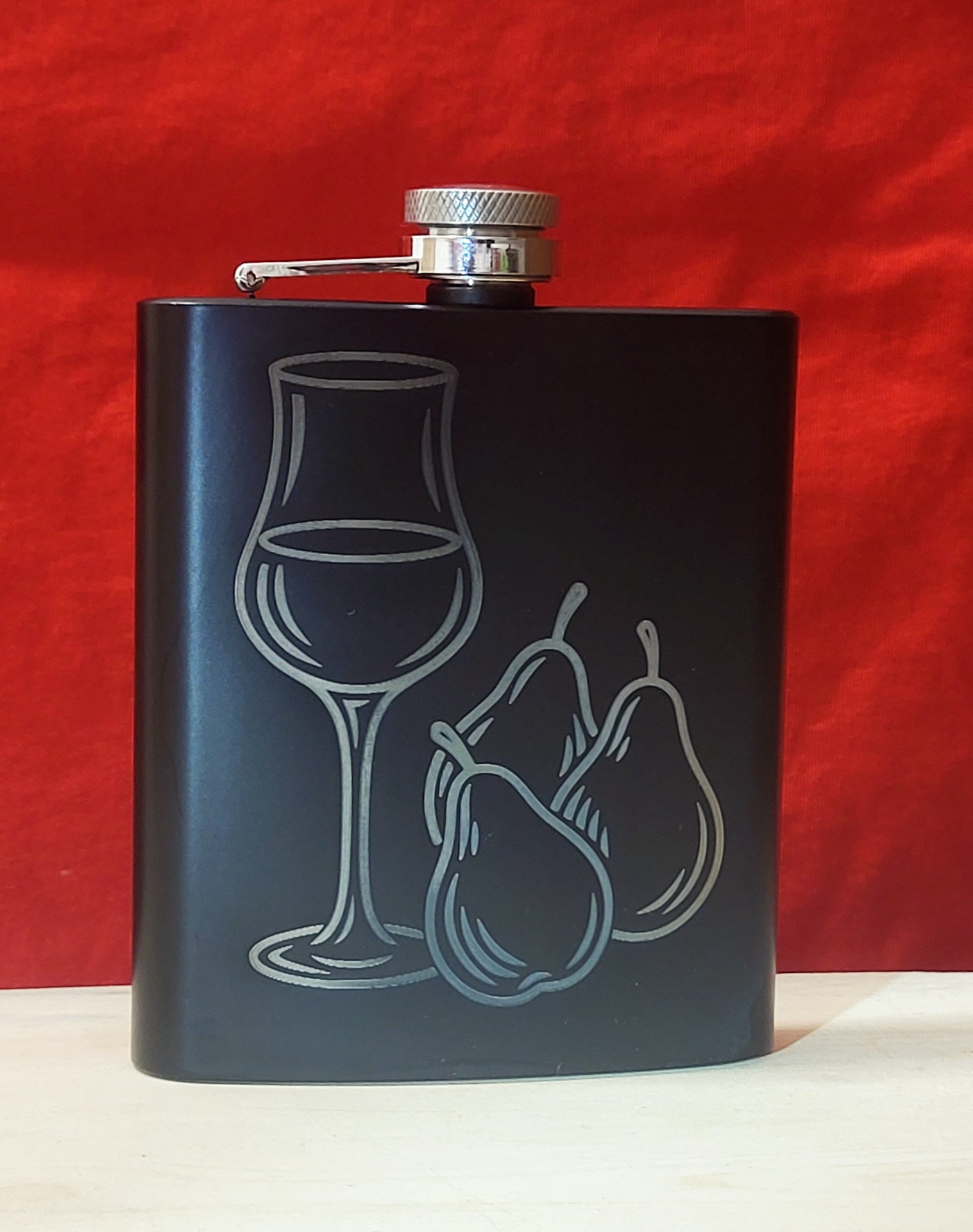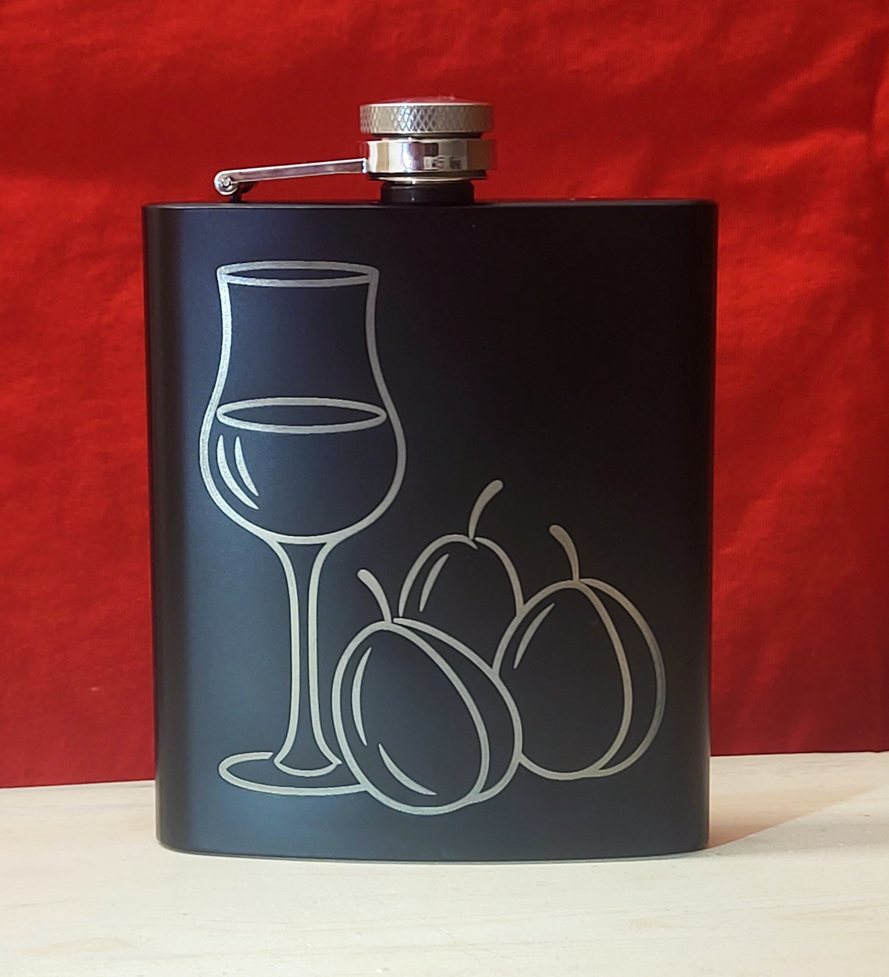 A flaskát alapból szilva vagy körte motívummal készítjük, de több tematikus minta is elérhető, így könnyen az ajándékozott stílusához igazítható.