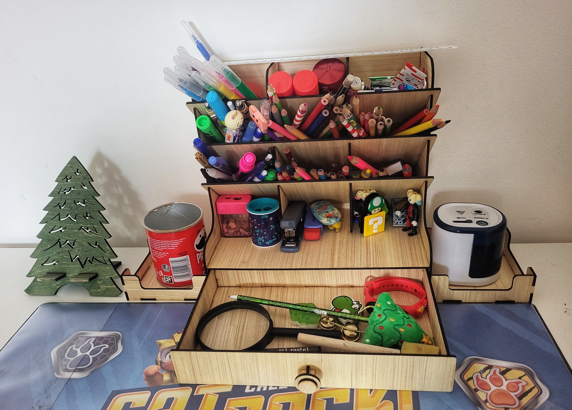 Ez a 3 mm-es rétegelt lemezből készült, többszintes asztali rendező segít, hogy minden apróságodnak legyen helye. A kilenc rekesz, a széles alsó tároló és az oldalsó tálcák együtt tökéletesen rendszerezik az irodai, kreatív vagy hobby-kellékeket.